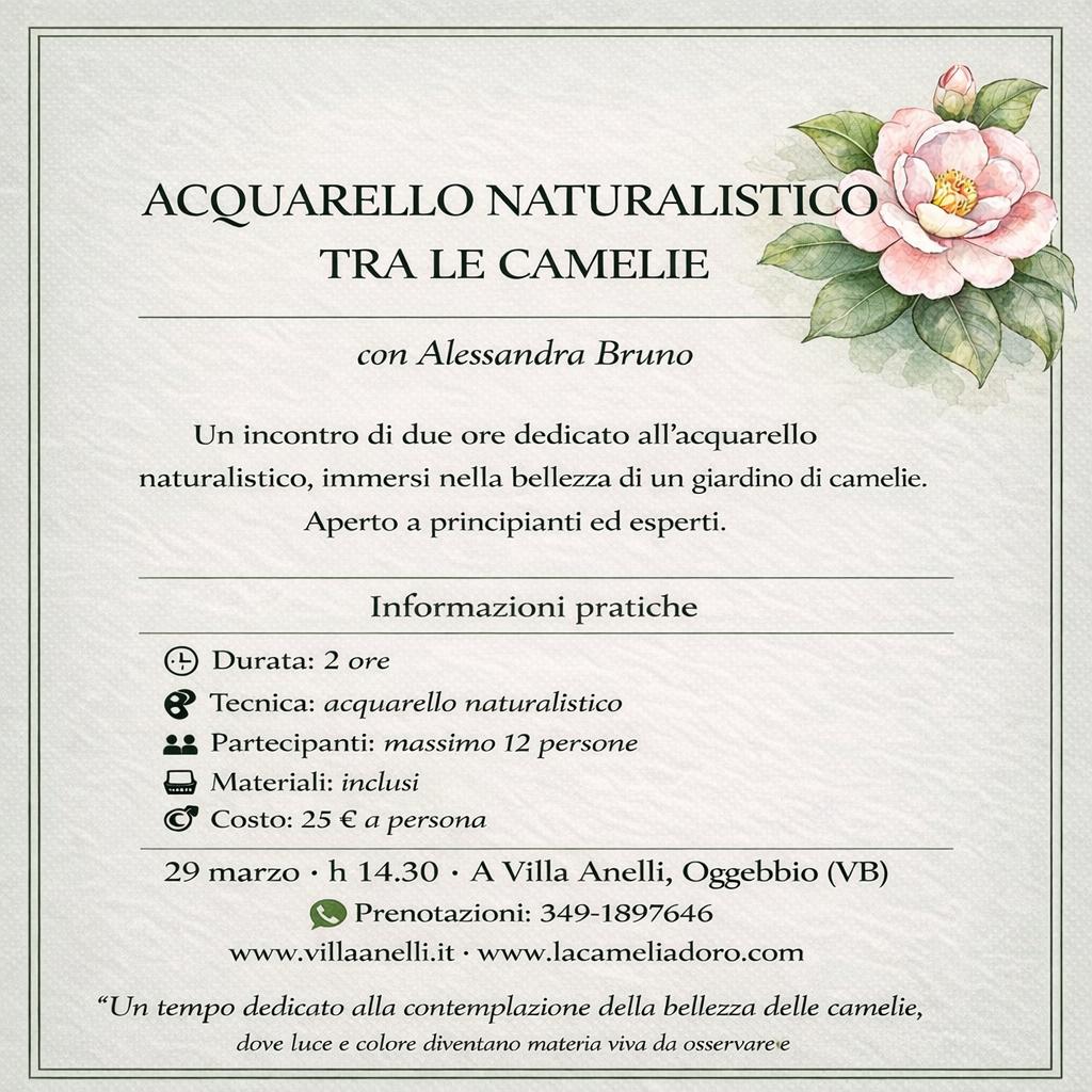 Immergiti nella delicatezza della natura e lasciati ispirare dalla bellezza delle camelie in fiore. Un’esperienza unica di due ore dedicata all’acquarello naturalistico, guidata dall’artista Alessandra Bruno, all’interno della suggestiva cornice di Villa Anelli.